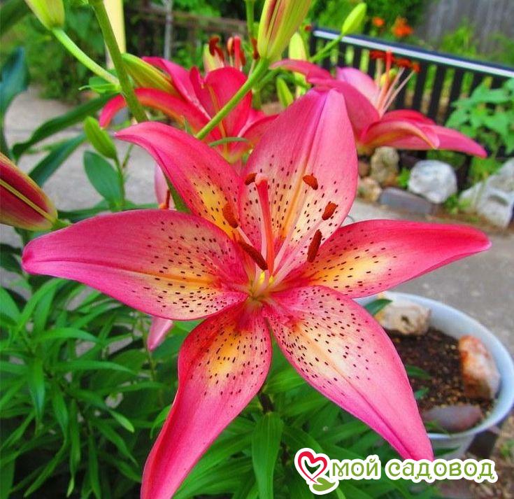 Цветы розового цвета, у горла пастельно-желтые пятна с темными вкраплениями. Без аромата. Диаметр цветка 15 см. Период цветения: июнь/июль. Высота растения достигает 100 см. Сорт достаточно неприхотлив и морозоустойчив. Уход за лилиями включает в себя прополки, поливы, рыхления, подкормки, борьбу с болезнями и вредителями. Поливают лилии в период цветения, поддерживая почву в увлажненном состоянии. Чтобы избежать пересыхания и перегрева почву мульчируют перегноем или торфом слоем в 5-6 см. Лилии хорошо отзываются на подкормки. Первую подкормку проводят весной после схода снега, разбрасывая по поверхности почвы азотные удобрения. Во время бутонизации растения поливают растворенной в воде аммиачной селитрой, непосредственно перед цветением использую фосфорно-калийные удобрения в жидком виде, в конце лета, но не позднее середины августа, лилии подкармливают фосфором и калием. Выращивать лилии на одном месте дольше 3-4 лет крайне нежелательно: луковица нарастает, становится рыхлой, растениям становится тесно по соседству. На 5 -6 год заметно снижается высота цветоноса, количество бутонов и значит, луковица истощена, а это может привести к заболеваниям и гибели растения. Осенью, когда надземная часть растения отмерла, стебель обрезают на высоте 15 см от поверхности почвы, гнездо выкапывают целиком, отделяют от материнской луковицы детки и высаживают их на доращивание. Саму материнскую луковицу пересаживают на новое место. В нашем интернет-магазине вы сможете купить Лилии Так же возможно вас заинтересуют Лилия-дерево Пурпл Принц и Лилия (ЛО-гибрид) Пинк Хевен